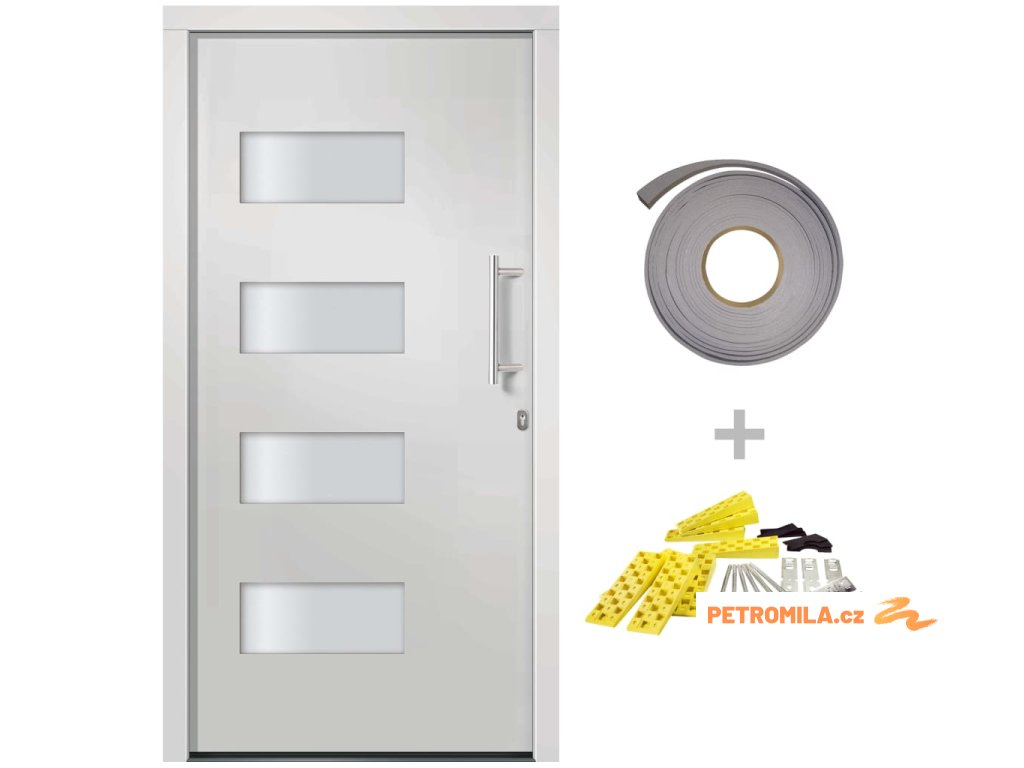 Vchodové dveře mají robustní rám i výplň, hliníkový práh, nastavitelné panty, bezpečnostní zámek s jazýčkem a háčkem a 5 stavítky, izolační zasklení a výztuhou z pozinkované oceli. Samotné dveře jsou vyrobené z hliníku a PVC a vyznačují se svou působivou bytelností a vysoce praktickým zamykáním. Obdržíte je spolu s kompletní sadou, která obsahuje nerezovou úchytku, vnitřní kliku, klíče, těsnící pásku a montážní příslušenství.