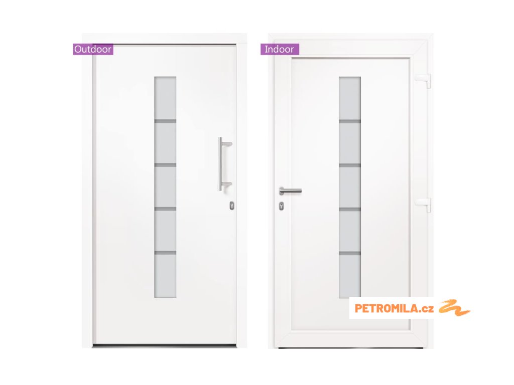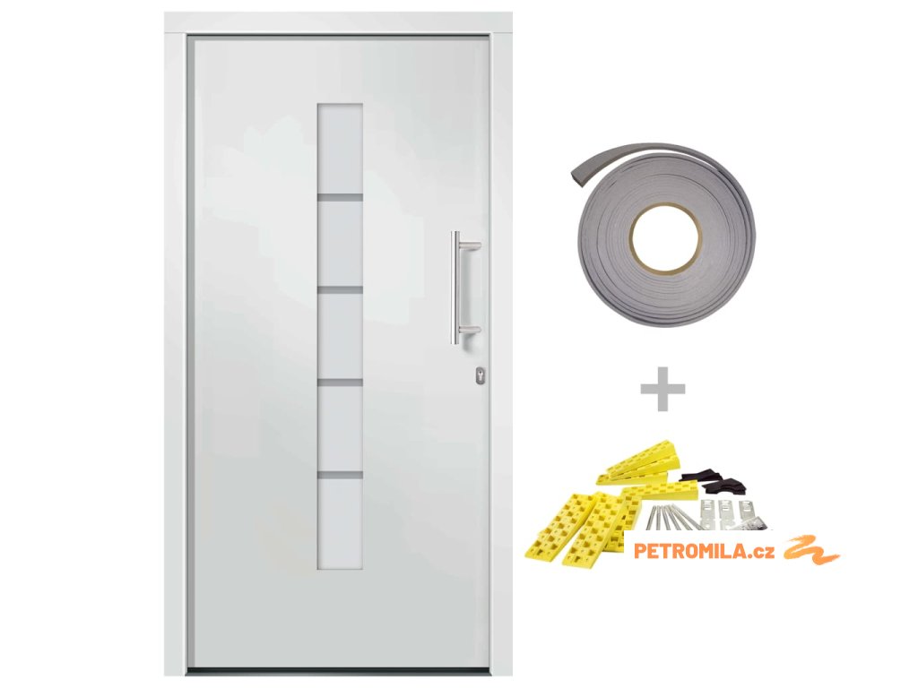 Vchodové dveře mají robustní rám i výplň, hliníkový práh, nastavitelné panty, bezpečnostní zámek s jazýčkem a háčkem a 5 stavítky, izolační zasklení a výztuhou z pozinkované oceli. Samotné dveře jsou vyrobené z hliníku a PVC a vyznačují se svou působivou bytelností a vysoce praktickým zamykáním. Obdržíte je spolu s kompletní sadou, která obsahuje nerezovou úchytku, vnitřní kliku, klíče, těsnící pásku a montážní příslušenství.
