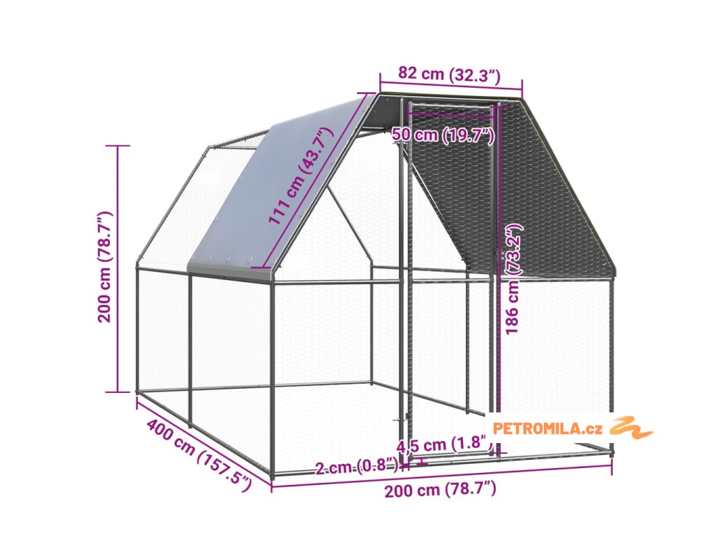 Tento výběh pro kuřata je vyroben z pozinkované oceli. Má polyethylenovou střechu, která je voděodolná a odolná vůči UV záření. Brána je vybavena zámkem, který zajišťuje větší bezpečnost a ochranu vašich malých zvířat.