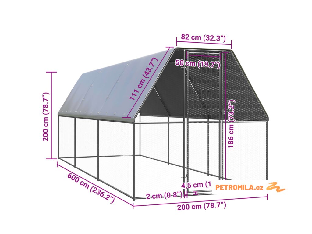 - Stabilní rám: Tento výběh pro kuřata je vyroben z pozinkované oceli. Kovové rámy zajišťují robustnost a stabilitu.