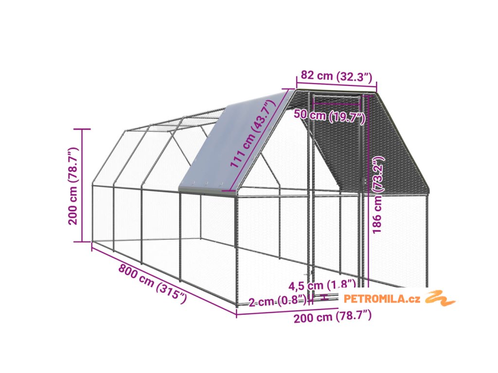 Tento výběh pro kuřata je vyroben z pozinkované oceli. Má polyethylenovou střechu, která je voděodolná a odolná vůči UV záření. Brána je vybavena zámkem, který zajišťuje větší bezpečnost a ochranu vašich malých zvířat.