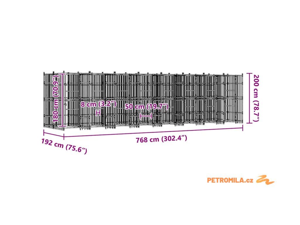 - Celkové rozměry: 768 x 192 x 200 cm (D x Š x V)