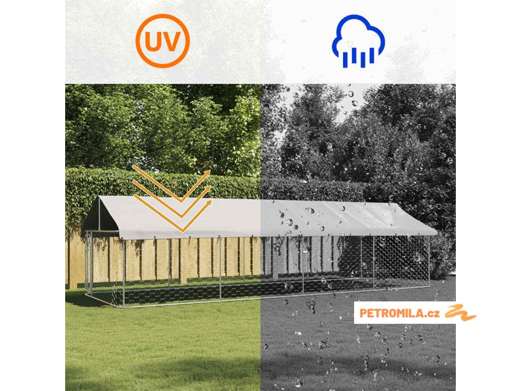 Velký psí kotec poskytne vašim psům spoustu prostoru k pohybu. Pletivo po celém obvodu zároveň zabrání neplechám a nehodám a umožní dostatečné větrání. Pevná konstrukce z vysoce odolné pozinkované oceli zaručuje, že toho kotec hodně vydrží a bude vám sloužit dlouhá léta. Součástí je rovněž střecha ze 100% polyethylenu, která je žáruvzdorná a odolná vůči UV záření a poskytuje ochranu před sluncem, deštěm, sněhem a dalšími klimatickými podmínkami. Dveře s panty lze zamknout na západku pro zvýšené bezpečí vašich psů.