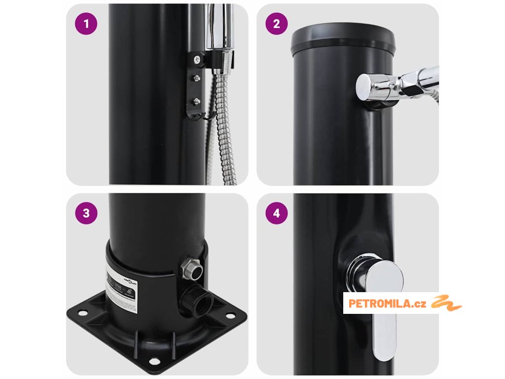 Tato venkovní solární sprcha přetvoří vaši zahradu na trendy útočiště díky svému elegantnímu, válcovému tvaru. Skvěle spojuje styl s praktikou, je pro ty, kdo mají rádi jednoduchost a efektivitu na svých venkovních prostorách. Užijte si osvěžující opláchnutí poháněné sluncem, ideální pro odpočinek u bazénu, a vychutnejte si minimalistický vzhled a funkční design.