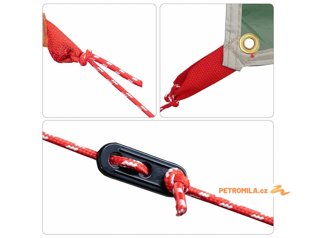 - Péče a údržba: Údržba této plachty znamená minimální úsilí. Čistění pomocí teplé vody se snadno zbaví nečistot a skvrn. Doporučuje se vyhnout se přímému slunečnímu záření během skladování, aby se zachovala její odolnost a účinnost, čímž se zajistí její připravenost na další outdoorové dobrodružství.