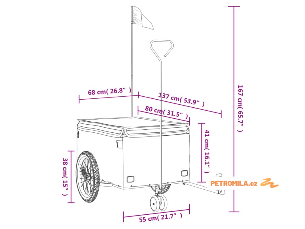- Robustní materiál: Železo je pevný a tvrdý materiál. Je to oblíbený materiál pro průmyslové a nábytkářské konstrukce. Tento přívěsný vozík za kolo je vyroben ze železa a je velmi robustní a odolný.