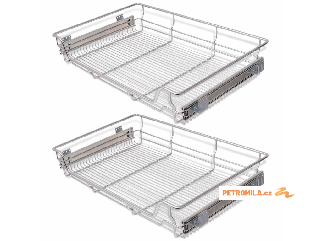 Tyto drátěné zásuvky s výsuvnými pojezdy s kuličkovými ložisky lze hladce otvírat i zavírat v celé jejich délce. Jsou vhodné pro skříňky nebo kredence o šířce 80 cm a každá z nich má maximální nosnost 25 kg.