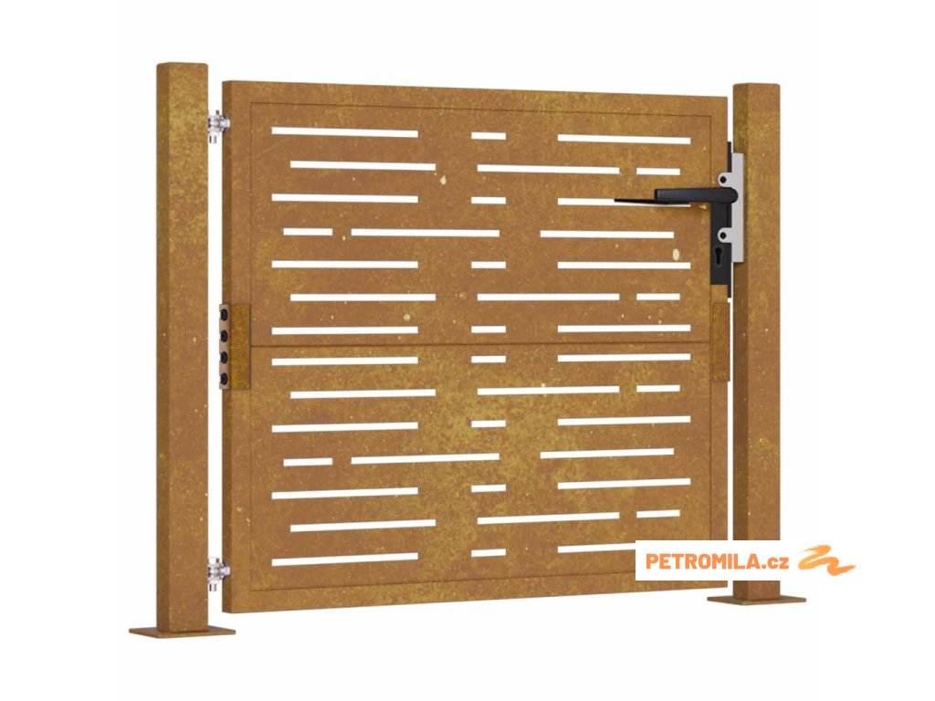 - Odolná konstrukce: Tato zahradní branka je vyrobená z cortenové oceli. Cortenová ocel, také známá jako povětrnostně odolná ocel. Je ze své podstaty antikorozní. Při prvním vystavení atmosférickým podmínkám se na ní vytvoří rezavá ochranná vrstva proti korozi. Nemusíte ji tedy natírat. Tím ušetříte náklady na údržbu a opravy. Výrazný hnědý odstín cortenové oceli jistě upoutá pozornost. Povětrnostně odolná ocel je výjimečně odolná a obstojí ve zkoušce času.
