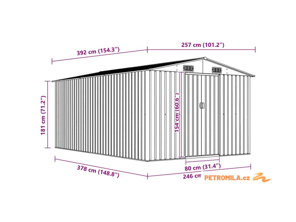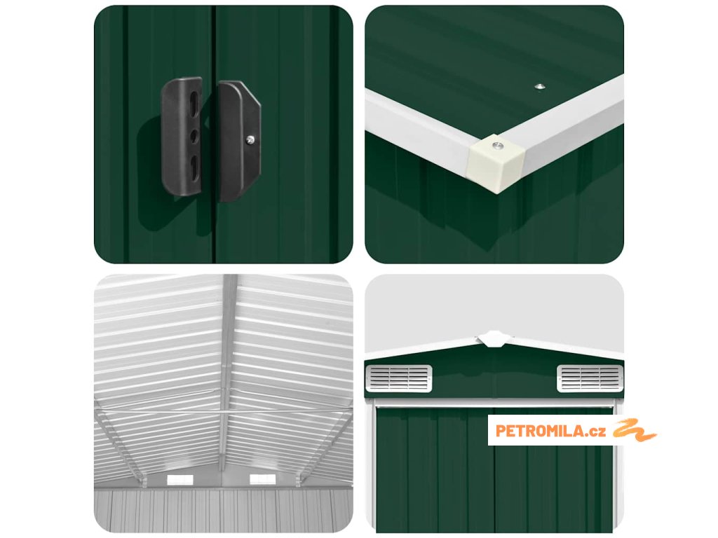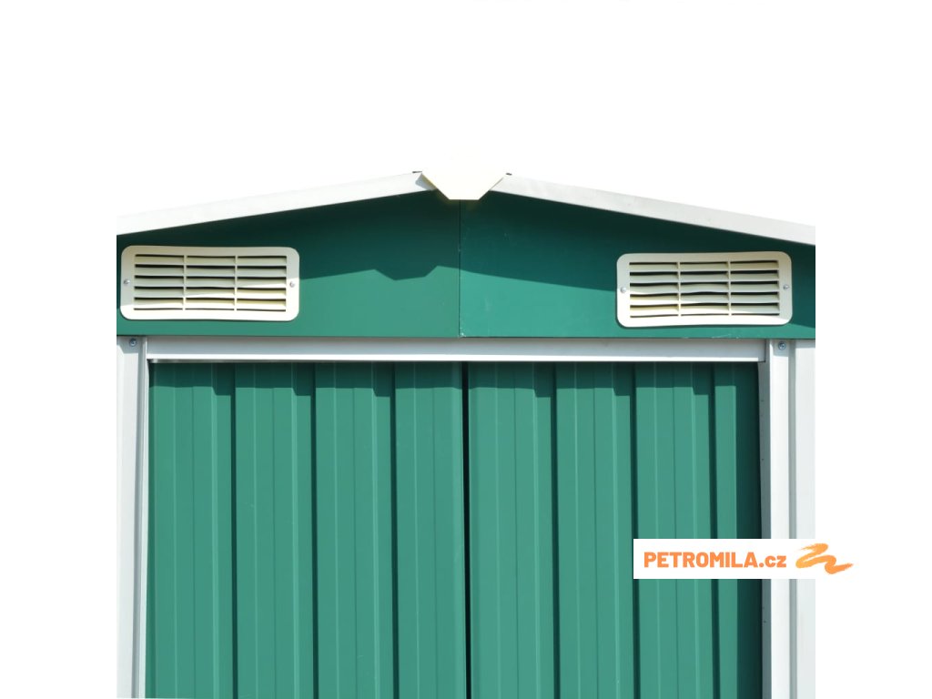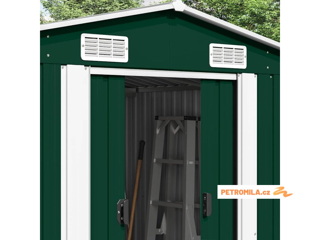 Tento úložný přístřešek má větrací otvory v přední i zadní části, které zajišťují vynikající ventilaci. Dvojité posuvné dveře v přední části umožňují snadný vstup a výstup. Konstrukce z pozinkované oceli spolu s práškovým nástřikem zaručují pevnost a odolnost kůlny na nářadí.