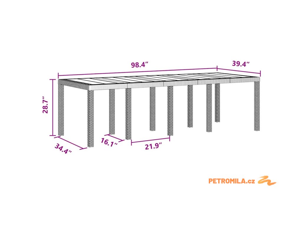 Tento elegantní moderní zahradní jídelní set spojuje elegantní současný design s praktičností, což ho činí dokonalým doplňkem venkovních prostor. Ideální pro stolování venku během letních měsíců, jeho obdélníková konfigurace podporuje rodinná shromáždění a elegantní večeře. Se zaměřením na jednoduchost a funkčnost tento set kombinuje čisté linie a minimální ozdobnost, aby vytvořil klidné venkovní prostředí.