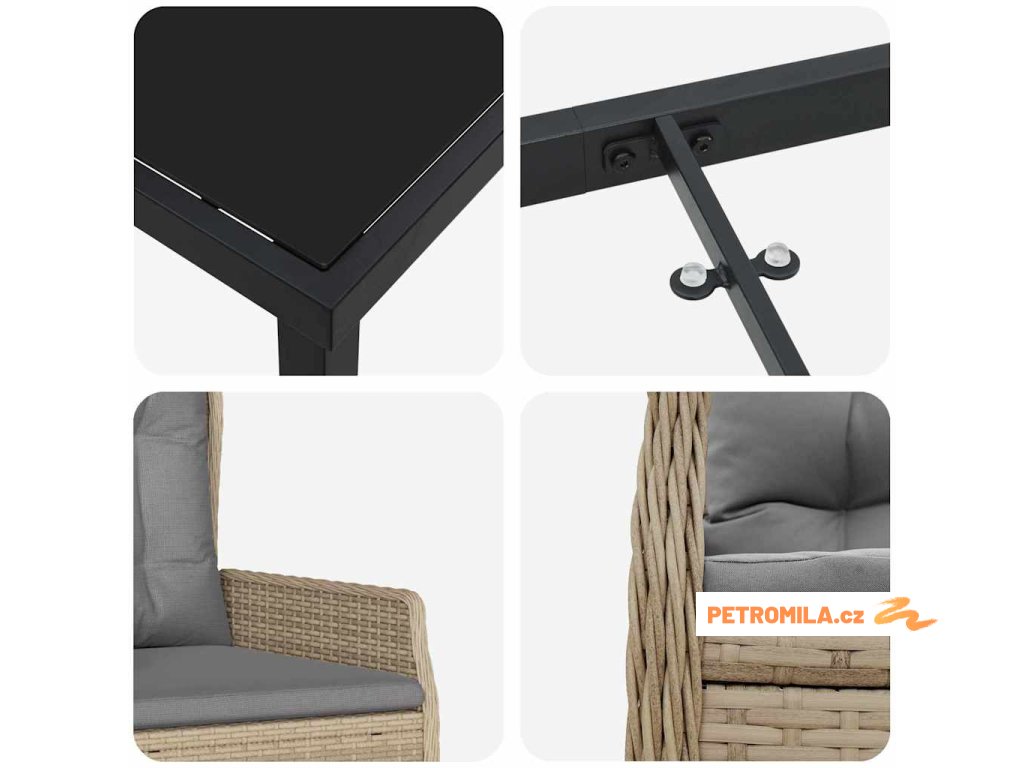 - Maximální Komfort – Ergonomicky navržená poly ratanová opěradla a podpěry na ruce, spolu s nastavitelnými opěradly, ti zajistí maximální pohodlí. Tyto funkce ti umožňují užívat si jídlo venku v pohodlí, což skvěle zapadá do moderního pojetí jednoduchosti a praktičnosti tohoto setu.