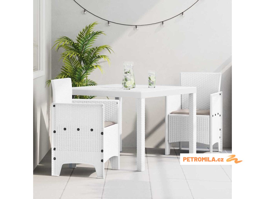 Materiály: Úplně vyrobeno z odolného poly ratanu, tento set je navržen tak, aby odolával venkovním podmínkám. UV-odolné vlastnosti zajišťují dlouhou životnost, což z něj dělá vynikající volbu pro letní jídelní setkání. Součásti: Tento jídelní set zahrnuje stůl a čtyři židle. Židle mají podrám a opěrku, což zvyšuje pohodlí i při delším sezení. Polštáře s pěnovým výplní poskytnou dodatečnou pohodlnost. Vlastnosti / Funkce / Design: Pevná a stabilní konstrukce umožňuje setu vydržet pravidelné používání na venkovních místech. Minimalistický design doplňuje různé estetické preference. Doporučené použití: Ideální pro venkovní terasy, zahrady nebo dvorky, nabízí vysoce stylový prostor pro stolování, socializaci nebo jen relaxaci s rodinou a přáteli. Péče a údržba: Otírejte povrchy vlhkým hadříkem a vyhněte se přímému slunečnímu světlu, abyste uchovali vzhled. Přeneste polštáře dovnitř během špatného počasí a zakryjte nábytek, když se nepoužívá.- Barva: Bílá