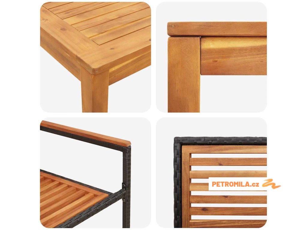 - Funkční komponenty Set zahrnuje obdélníkový stůl, židle s sedáky a opěradly z masivního akáciového dřeva a poly ratanové opěrky na ruce, každá z nich zpracována s pečlivostí. Tyto kvalitní komponenty poskytují pohodlí a odolnost, což dělá stolování nebo odpočinek venku potěšením.