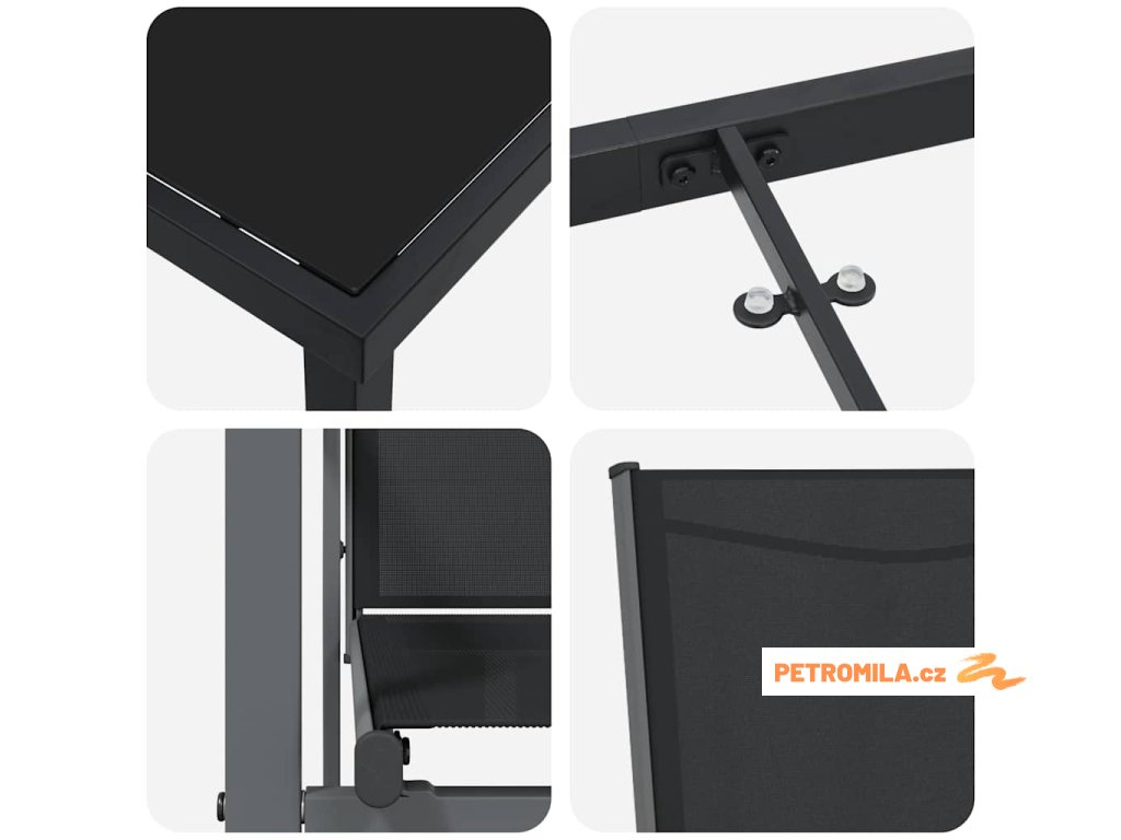 - Funkce / Design: Tento set se vyznačuje moderní jednoduchostí a praktickým designem. Je z UV-odolných materiálů, takže se nemusíte bát, že by se vybledl nebo poškodil na slunci. Práškově lakovaný povrch mu dodává další trvanlivost a stále dobře vypadá.