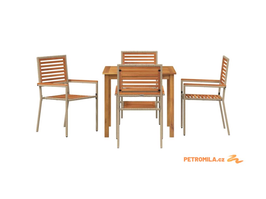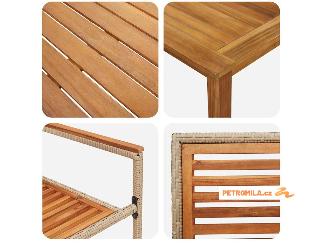 - Materiály: Jídelní souprava je z masivního akáciového dřeva, které se vyznačuje odolností a hezkými vzory. Spolu s rámem z poly ratanu zajišťuje stabilní a stylové řešení pro venkovní odpočinek, odolávající povětrnostním vlivům.