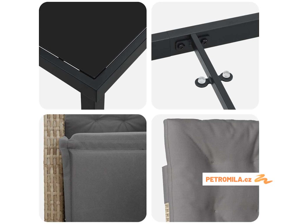 - Kvalitní materiály: Tento set je vyrobený z prvotřídního poly ratanu, co je špičkový a odolný vůči počasí, takže je ideální pro venkovní použití. Skleněné desky dodají kousek elegance a snadno se čistí.