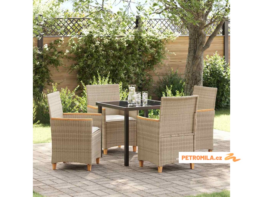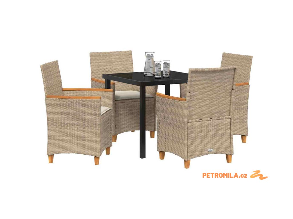- Materiály: Jídelní set je vyrobený z odolného poly ratanu, který vydrží veškeré počasí. Můžete si tak v klidu užívat venku bez stresu z údržby, a to dá víc času na relaxaci.