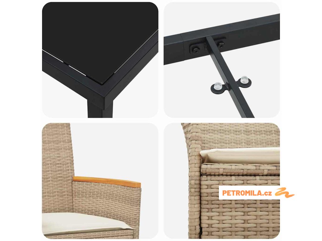 - Součásti: S elegantním skleněným vrškem a štíhlými ocelovými nohami přidá set elegantní vzhled, kamkoli ho dáte. Polyratanové opěrky jsou pohodlné a polštáře z polyesteru zajišťují komfortní sezení.