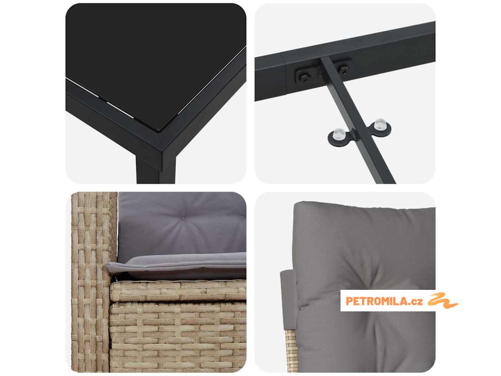 - Součásti setu: Tenhle set má pohodlné židle s možností nastavení, takže si je můžeš přizpůsobit podle svého pohodlí. Sedadla a opěradla z poly ratanu jsou robustní, ale zároveň pohodlné. Opěrky rukou ladí s židlemi a zvyšují jak styl, tak komfort. Stylový skleněný stůl povyšuje tvoje jídelní zážitky a je praktický i elegantní.