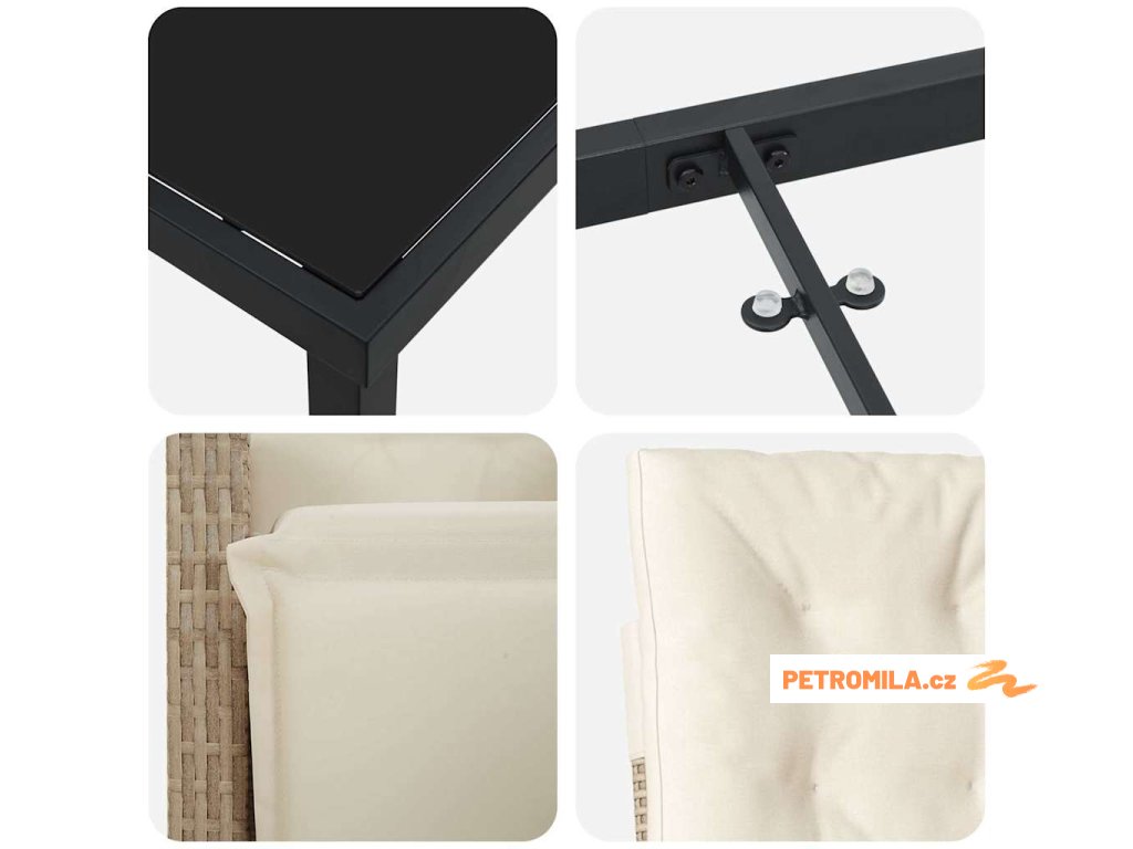 - Kvalitní materiály: Tento set je vyrobený z prvotřídního poly ratanu, co je špičkový a odolný vůči počasí, takže je ideální pro venkovní použití. Skleněné desky dodají kousek elegance a snadno se čistí.