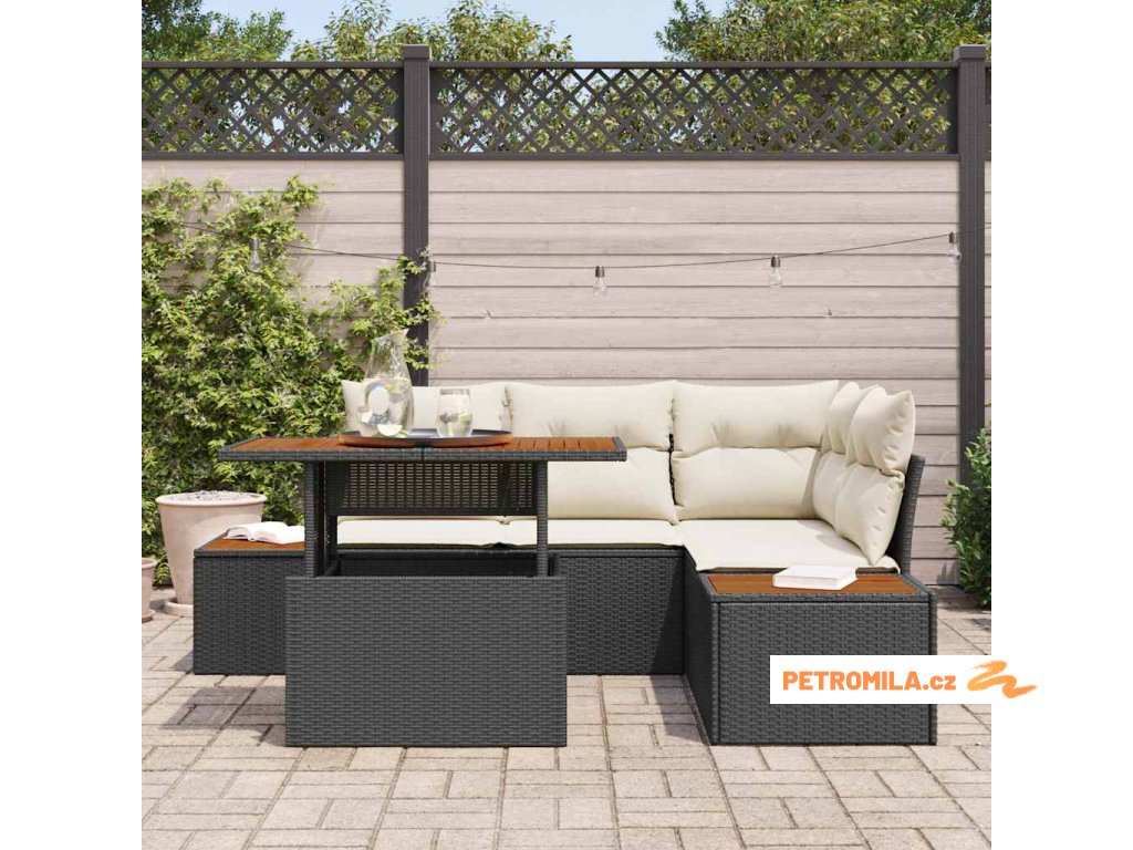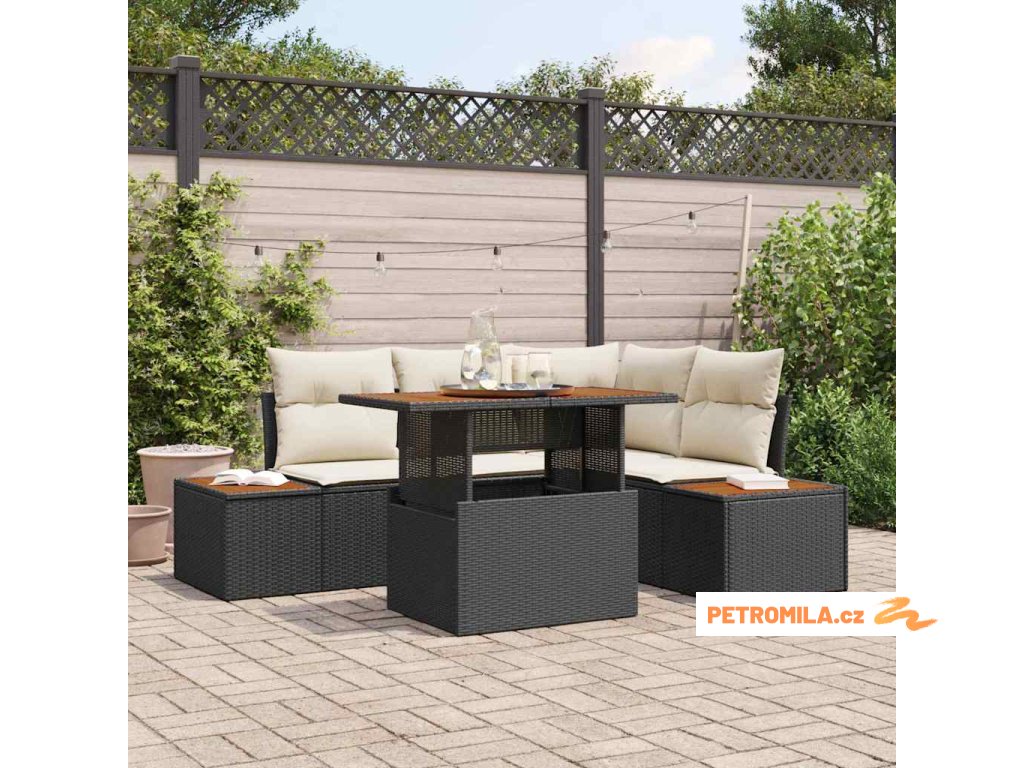 - Co je součástí: Set věrně obsahuje dvě boční sofa, rohové křeslo, středové křeslo a zahradní stůl. Každý kus má úložný prostor, což je praktické.