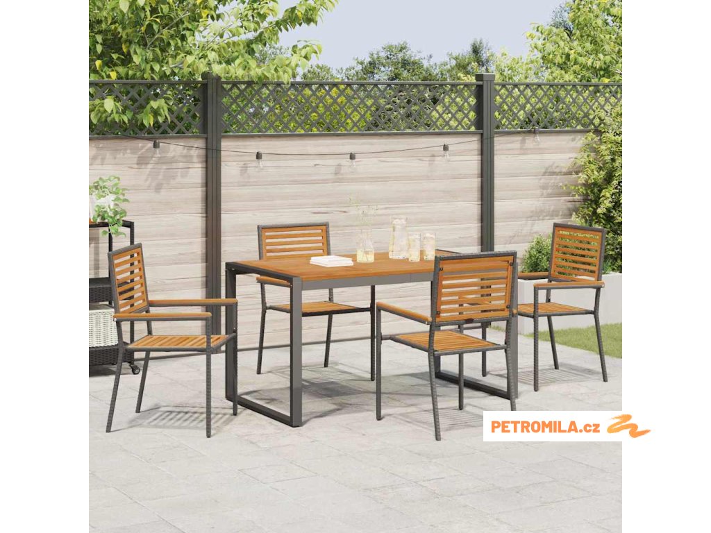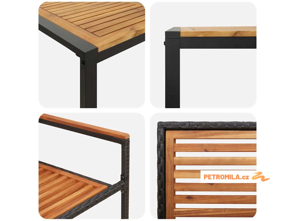 - Materiály: Sada je z kvalitního poly ratanu, který jí dodává hezký vzhled a vysokou odolnost. Pevné akáciové dřevo přidává sílu a teplou barvu. Tyhle materiály jsou vybrané pro venkovní použití, takže je obě funkční a pěkná.