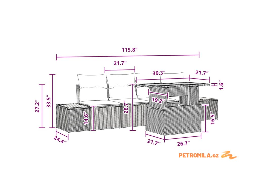 - Vlastnosti / Funkce / Design: Modulární design setu umožňuje přizpůsobitelné konfigurace, které se přizpůsobují různým tvarům a velikostem teras. Nastavitelné nožičky pomáhají vyrovnat nábytek na nerovných plochách a zároveň zajišťují stabilitu. S odnímatelnými a zipovými potahy na sedáky se údržba a čištění stanou snadnými.