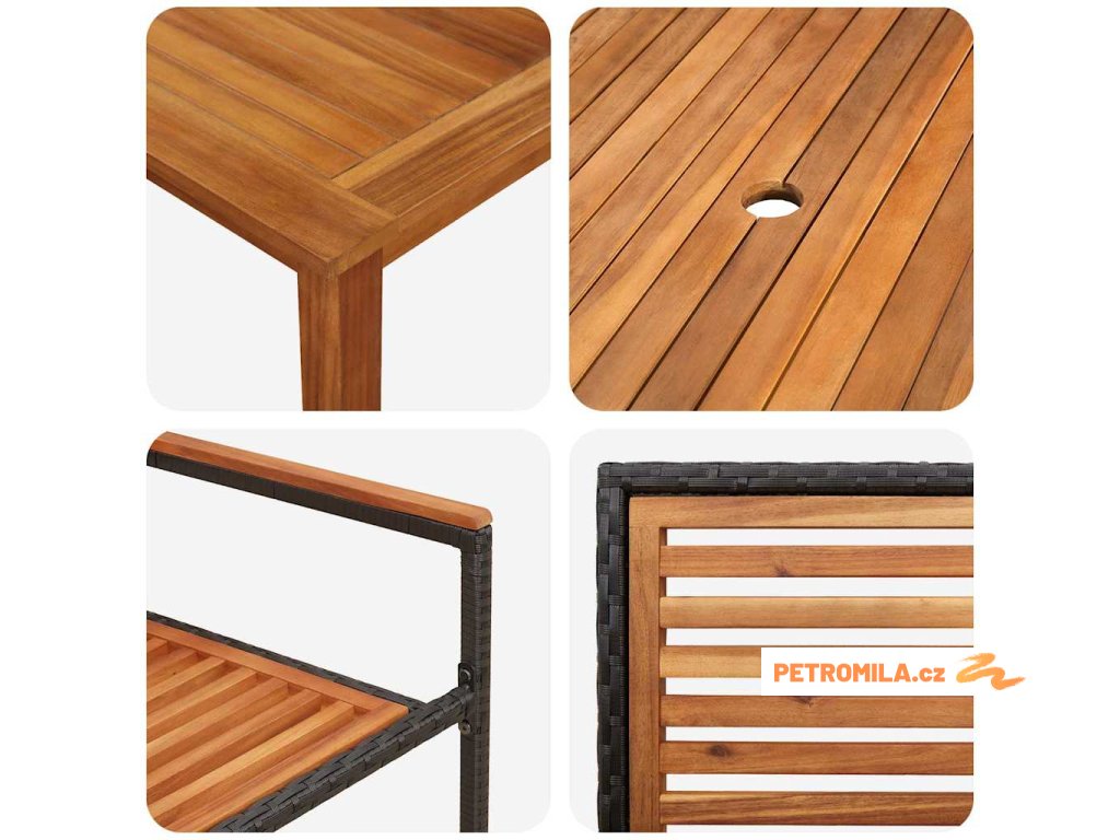 - Materiály: Jídelní souprava je z masivního akáciového dřeva, které se vyznačuje odolností a hezkými vzory. Spolu s rámem z poly ratanu zajišťuje stabilní a stylové řešení pro venkovní odpočinek, odolávající povětrnostním vlivům.