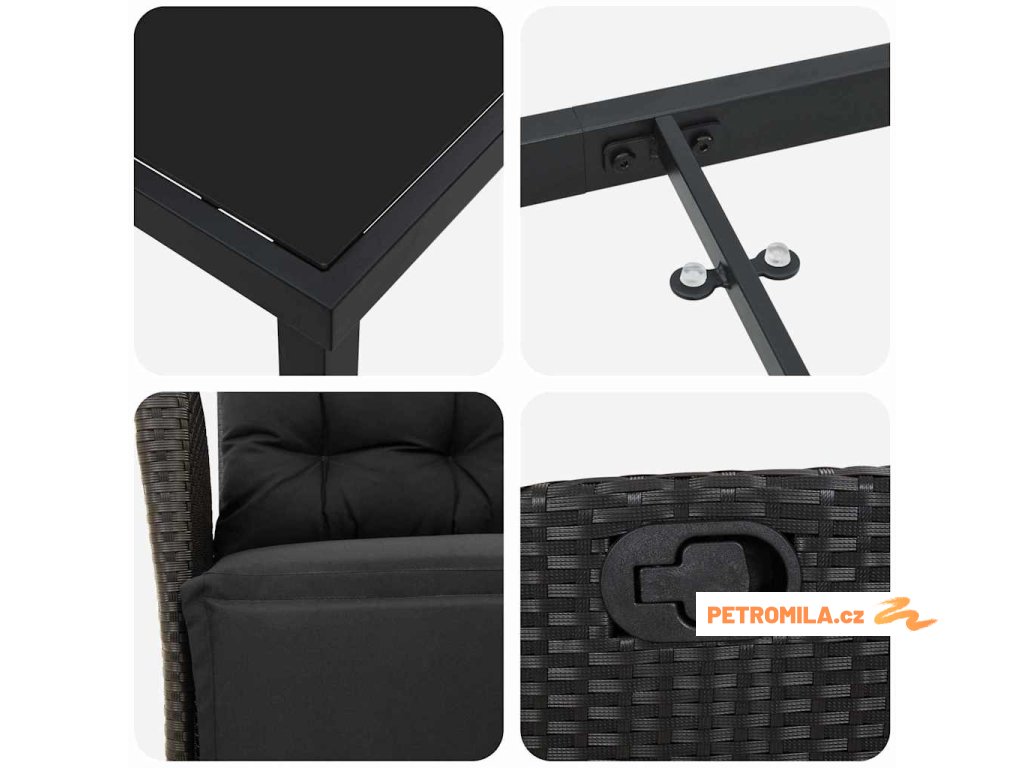 Tahle nastavitelná zahradní jídelní souprava posouvá venkovní lenošení a stolování na novou úroveň. Její elegantní a moderní styl s čistými liniemi a jednoduchostí dodává každému venkovnímu prostoru příjemný pocit. Ideální pro zahrady a terasy, skvěle se hodí na letní promoce a rodinné večeře. Černá tkaná textura skvěle ladí s práškově lakovaným kovem, takže máš stylový a odolný set, který vydrží, co počasí přinese, a je i pohodlný.
