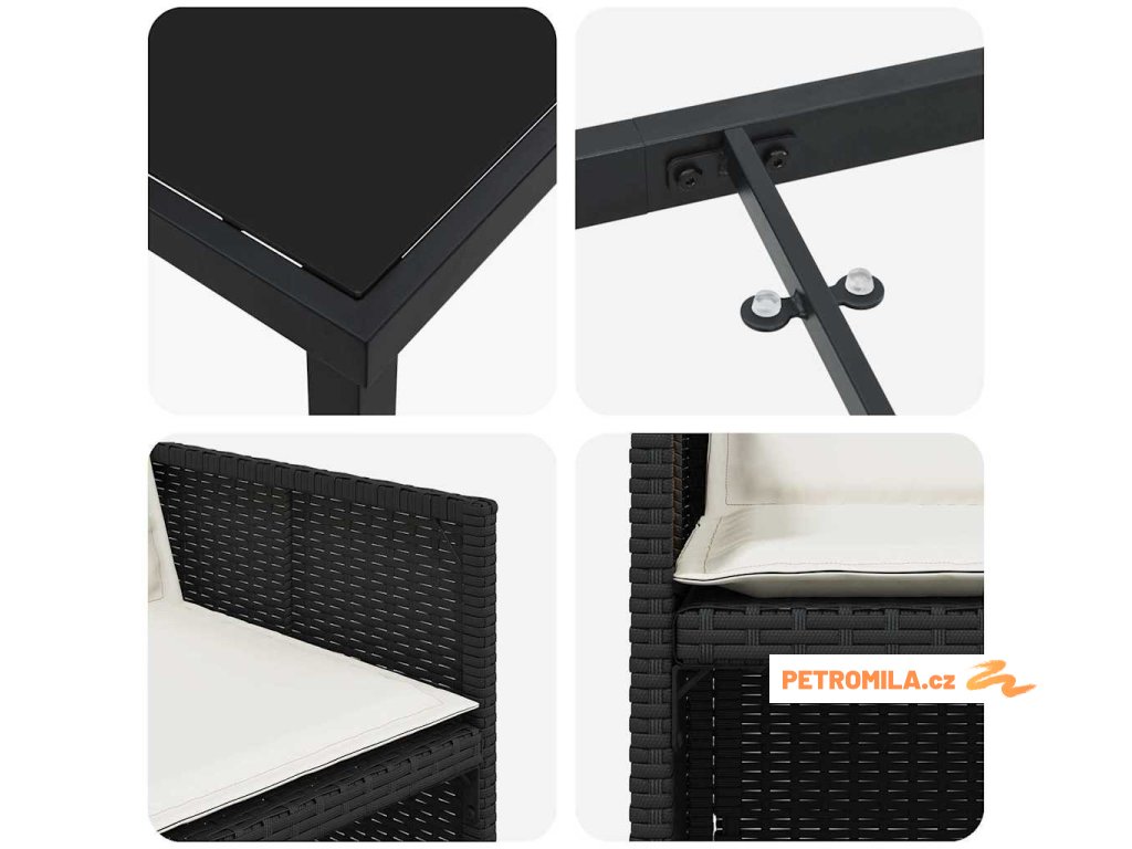 - Moderní materiály: Tento set je udělaný z chytré směsi poly ratanu a skla, což mu dodává originální styl. Poly ratan je známý svou odolností vůči počasí a barvy si dlouho udržuje. Skleněné povrchy přidávají elegantní a moderní vzhled, který skvěle vypadá venku a snadno se čistí.