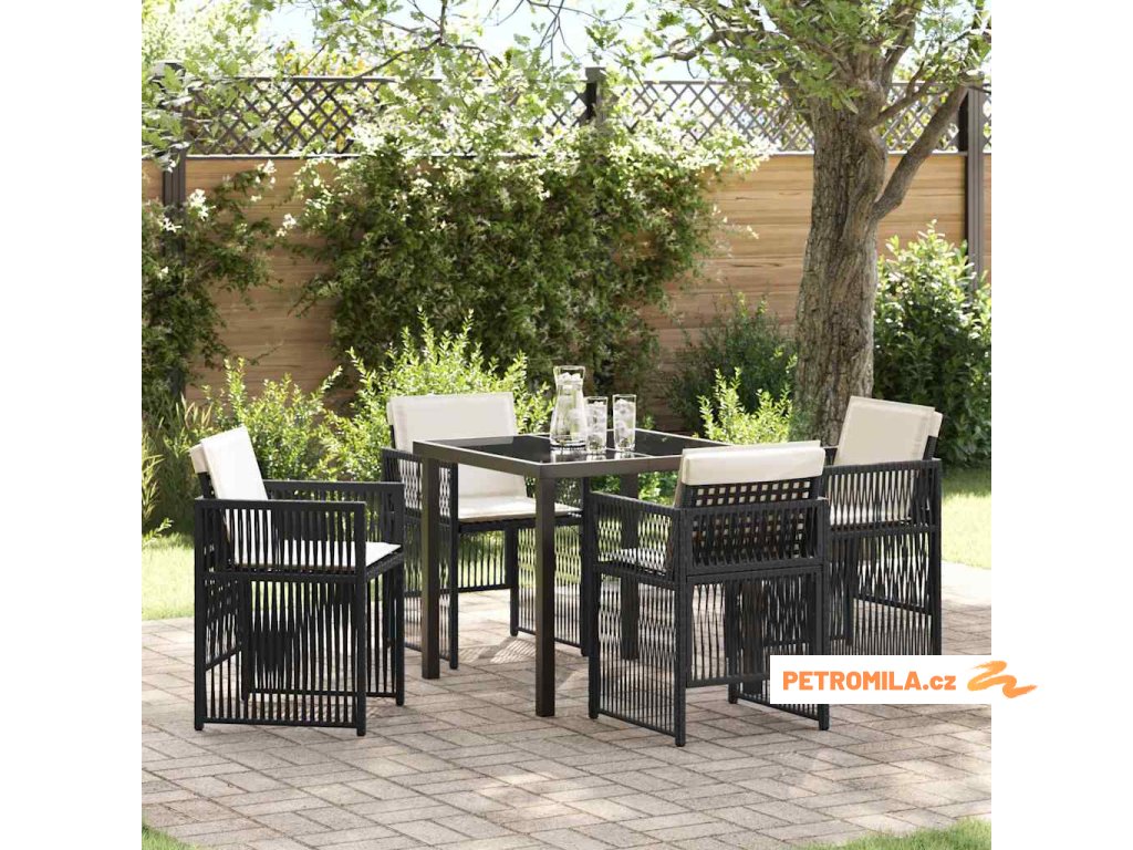 - Materiály: Tento moderní zahradní jídelní set je vyroben z práškově lakované oceli, což zajišťuje pevnost i odolnost vůči povětrnostním podmínkám. Tím se set stává dlouhotrvajícím centrem vašich venkovních prostor. Poly ratan na opěrkách navíc zvýrazňuje pohodlí a styl celého setu.