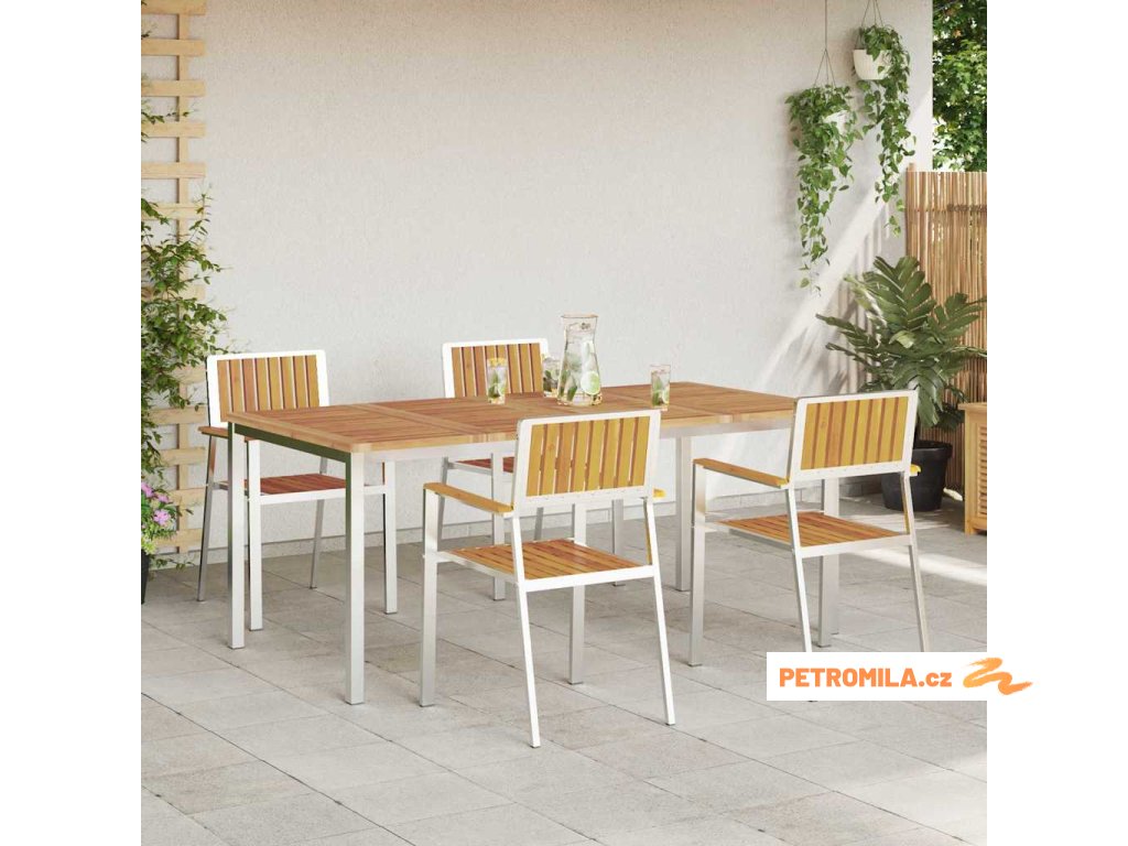 - Rám z nerezové oceli: Tento zahradní jídelní set má pevný rám z nerezové oceli, což zajišťuje stabilitu a odolnost venku. Materiál zvládá vlhké podmínky, takže je to váš spolehlivý parťák pro venkovní jídla. Nerezová ocel vypadá skvěle a zároveň je funkční a stylová.