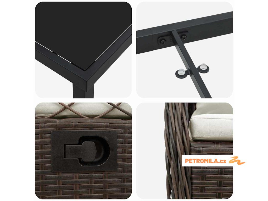 - Materiál konstrukce: Tato zahradní jídelní sada je vyrobená z top polyratanu, který je super odolný a vhodný pro venkovní použití. Silný ocelový rám ji zpevňuje a vypadá fakt dobře.