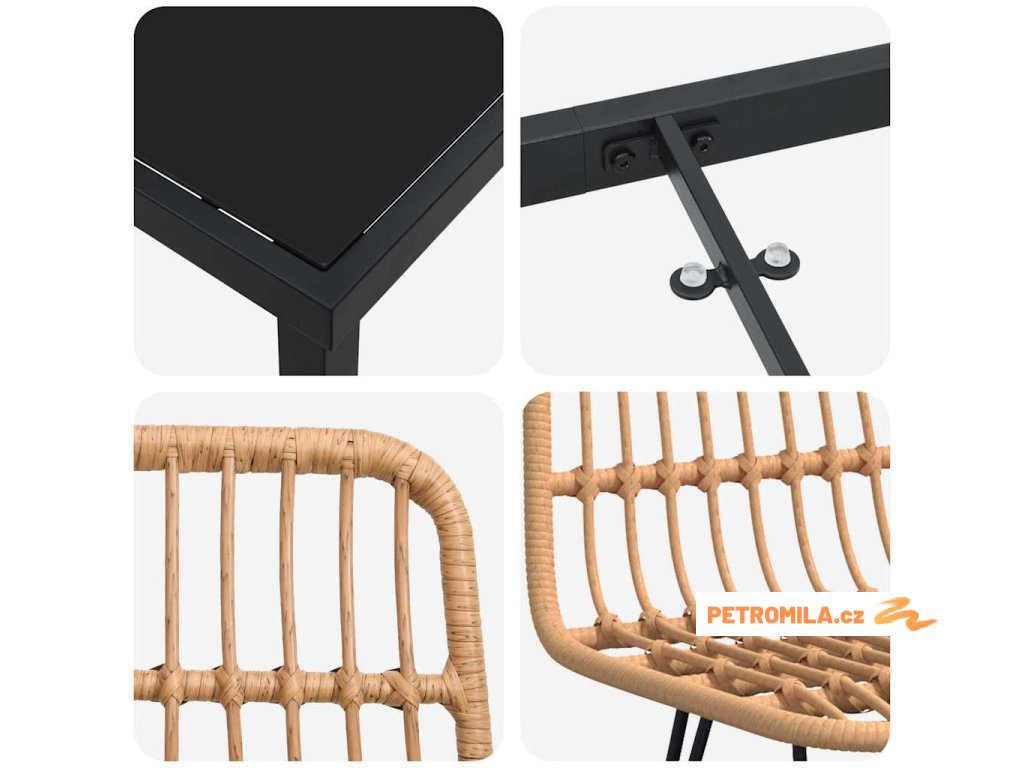 - Odolné materiály vůči počasí: Tato jídelní souprava je z kvalitních materiálů, jako je poly ratan a práškově lakovaná ocel, které zvládnou venkovní podmínky, včetně UV záření a vlhkosti. Díky tomu vypadá skvěle i po delším používání, takže vaše investice se vyplatí.