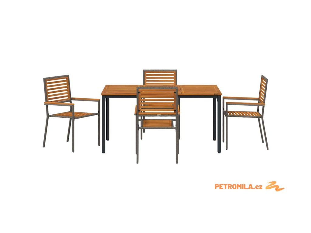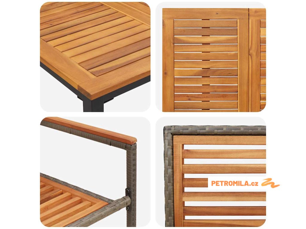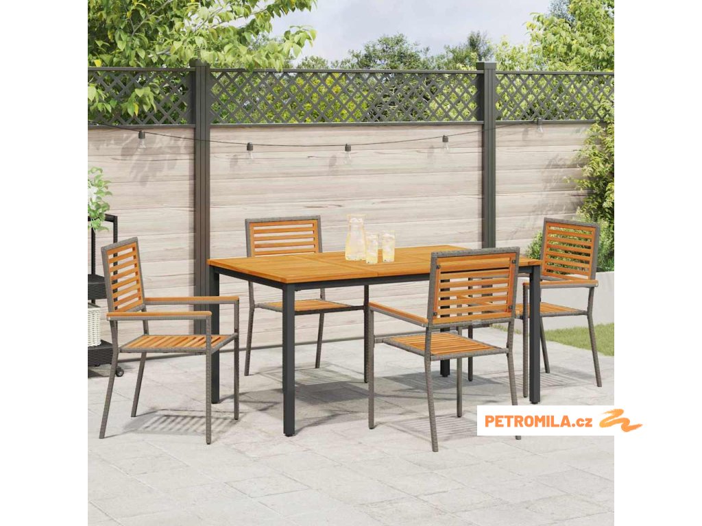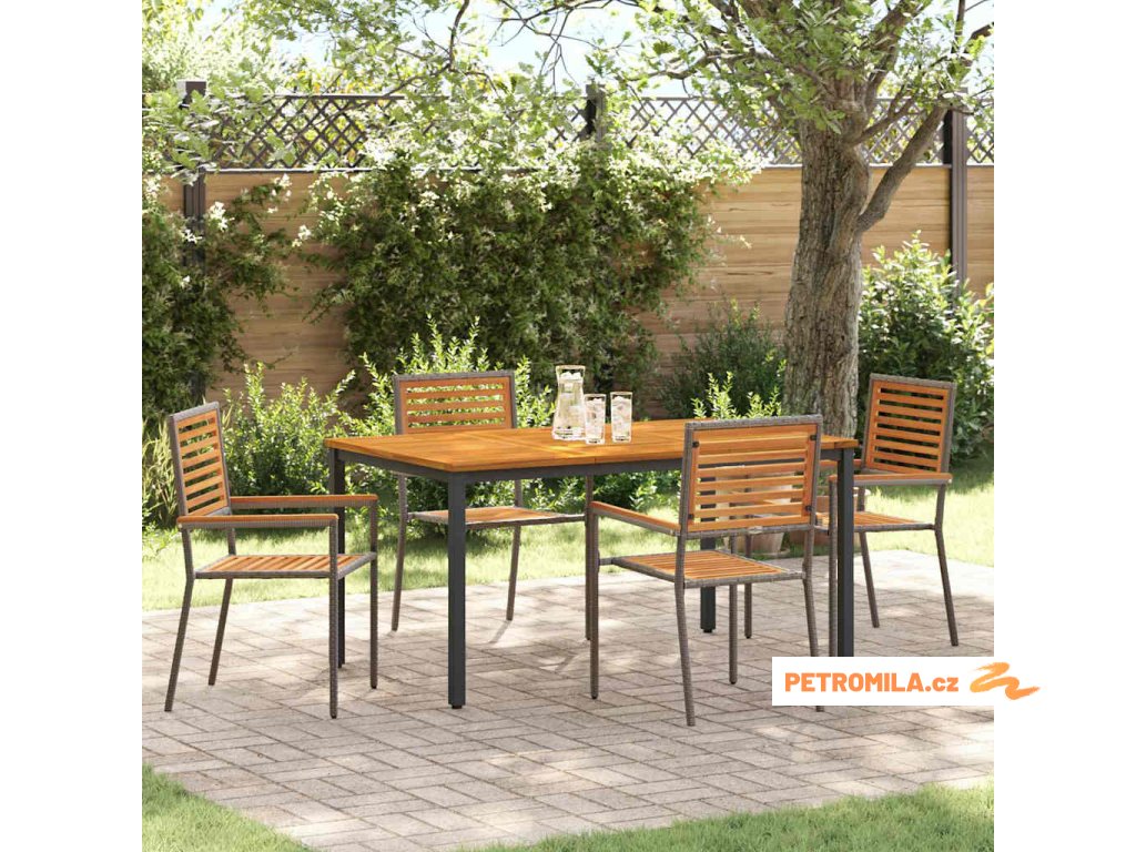 - Odolné materiály: Tenhle moderní zahradní jídelní set šikovně míchá poly ratan a masivní akáciové dřevo pro silnou a dlouhotrvající konstrukci. Poly ratan mu dodává stylový moderní vzhled, zatímco akácie dává teplou a příjemnou atmosféru, která zvládne opotřebení a sezónní změny.