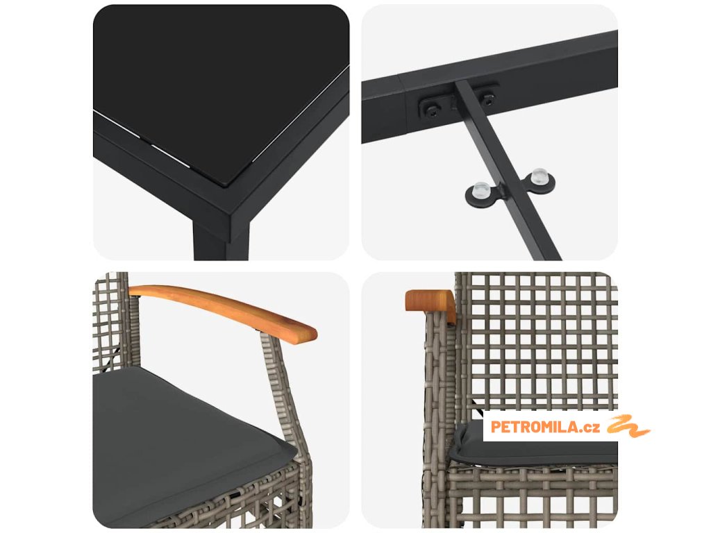 - Praktické funkce: S pevnými ocelovými nohami a rámy, každý kousek v tomto setu slibuje stabilitu a dlouhou životnost. Akáciové opěrky rukou skvěle ladí s pohodlnými poly ratanovými opěradly, takže to má jak hezký vzhled, tak funkčnost pro venkovní stolování.