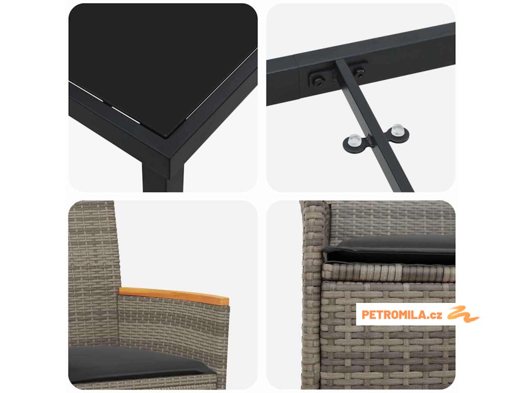 - Součásti: S elegantním skleněným vrškem a štíhlými ocelovými nohami přidá set elegantní vzhled, kamkoli ho dáte. Polyratanové opěrky jsou pohodlné a polštáře z polyesteru zajišťují komfortní sezení.