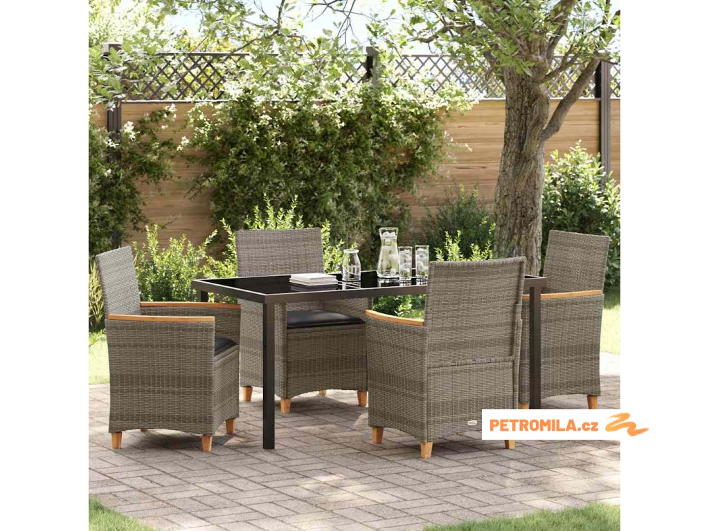 - Materiály: Jídelní set je vyrobený z odolného poly ratanu, který vydrží veškeré počasí. Můžete si tak v klidu užívat venku bez stresu z údržby, a to dá víc času na relaxaci.