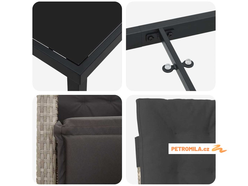 - Kvalitní materiály: Tento set je vyrobený z prvotřídního poly ratanu, co je špičkový a odolný vůči počasí, takže je ideální pro venkovní použití. Skleněné desky dodají kousek elegance a snadno se čistí.