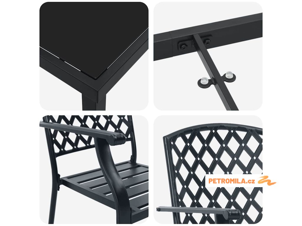 - Součásti: Souprava zahrnuje odolný skleněný stůl, který je skvělý na jídlo a povídání. Silné ocelové rámy zajišťují stabilitu, zatímco antracitová barva úžasně ladí s moderním zahradním stylem. Obsahuje pohodlné područky a opěrky pro maximální komfort během jídla.