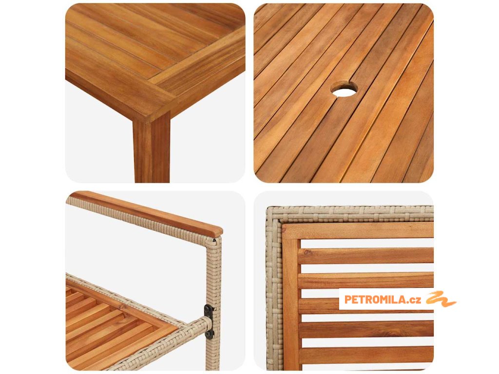 - Materiály: Jídelní souprava je z masivního akáciového dřeva, které se vyznačuje odolností a hezkými vzory. Spolu s rámem z poly ratanu zajišťuje stabilní a stylové řešení pro venkovní odpočinek, odolávající povětrnostním vlivům.