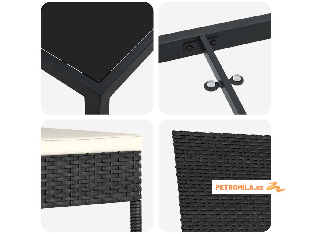 - Součásti: Souprava zahrnuje skleněnou desku stolu, která dodává elegance a snadno se udržuje. Tkaná opěra z polyratanu nabízí styl a pohodlí, zatímco polyesterové polštáře mají zipy pro jednoduchou údržbu. Černý práškově lakovaný ocelový rám to všechno spojuje a zajišťuje spolehlivost po mnoho let.