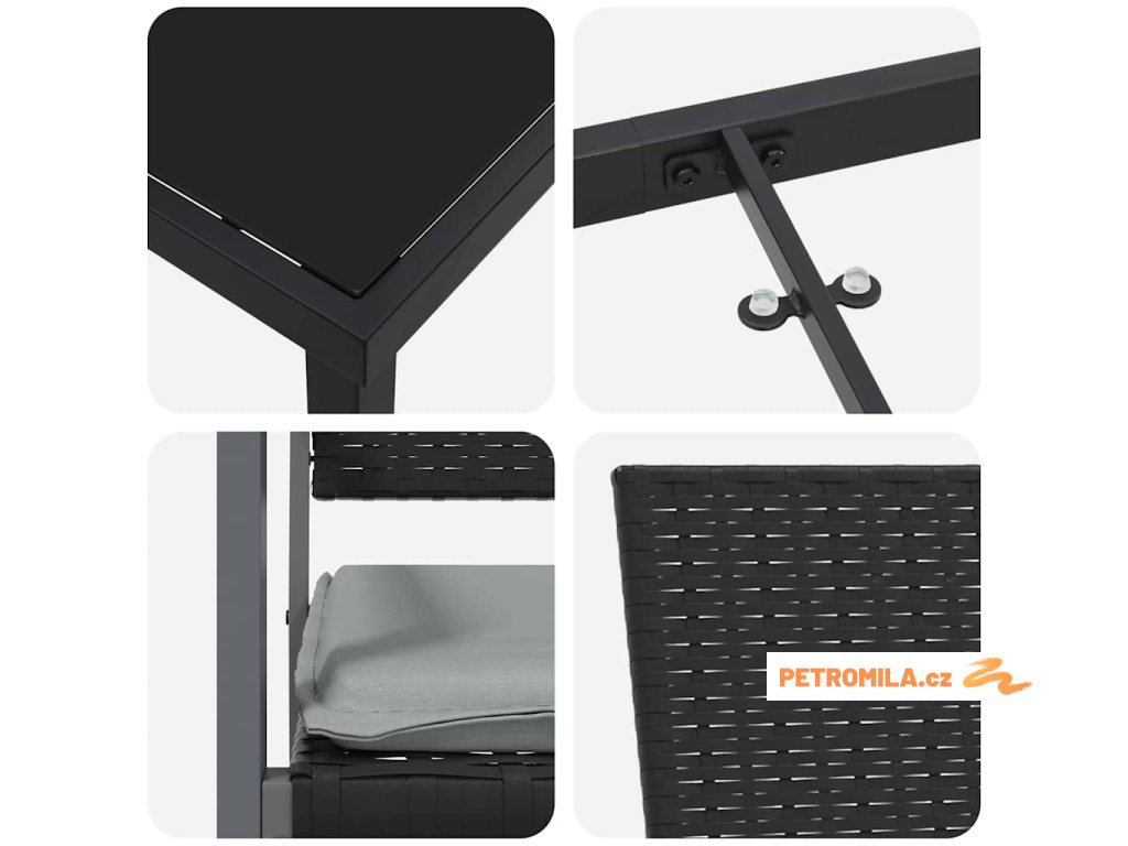 - Tvrzené skleněné povrchy: Stůl má vrchní část z tvrzeného skla, která spojuje eleganci s praktičností. Tento povrch odolává poškrábání a je snadno čistitelný, což je významná výhoda pro venkovní stolování. Černá barva ladí s moderním stylem a zvyšuje celkovou atmosféru zahrady a vizuální přitažlivost sady.