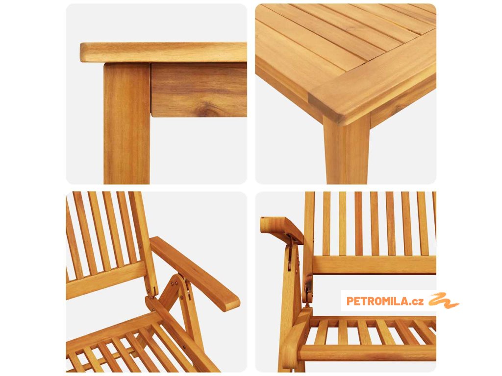 - Solidní akáciové dřevo: Celá souprava je kompletně z masivního akáciového dřeva, známého svou odolností a schopností zvládnout různá počasí. Dřevo je pečlivě vybírané, aby bylo robustní a dlouho vydrželo i venku, a souprava si tak zachová svůj vzhled po celou sezónu.