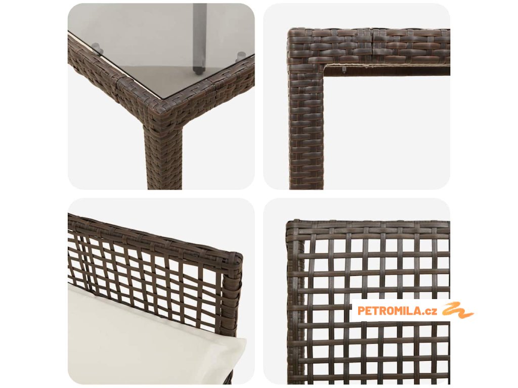 - Vysoce kvalitní poly ratan: Tato souprava je vyrobená z odolného poly ratanu, který zvládá různý počasí a každodenní používání. Její tkaný vzhled dodává chic atmosféru, která se hodí do každé zahrady a dává vám pohodlí díky chytrému designu.