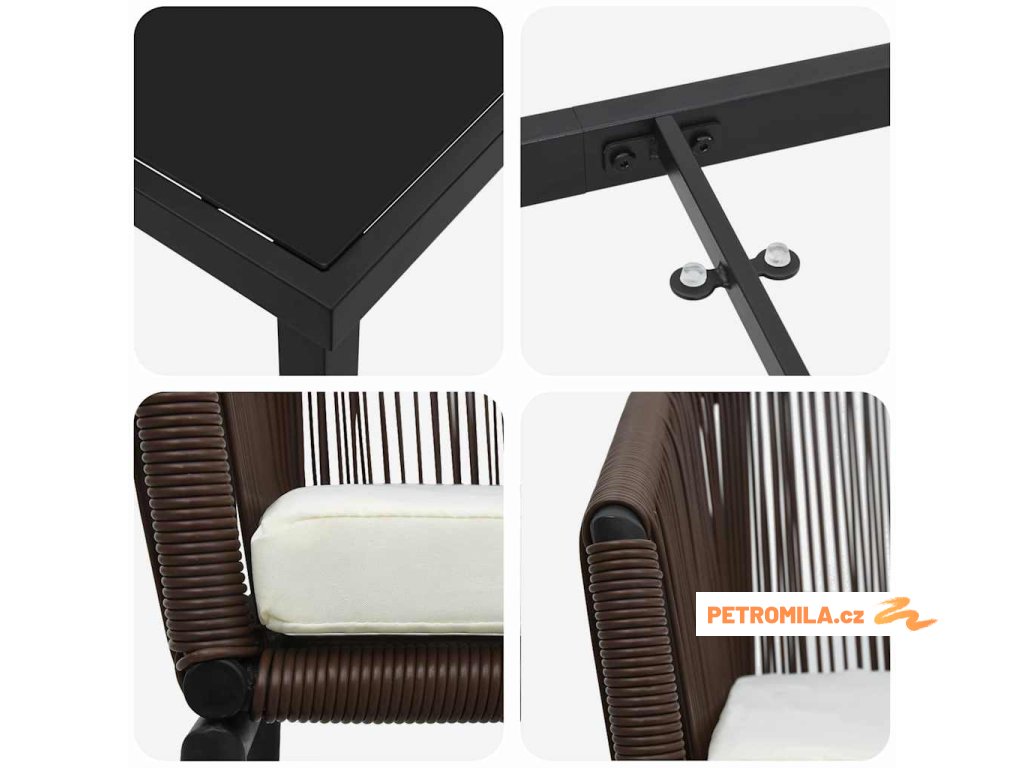 - Materiály: Tato moderní sada zahradního nábytku kombinuje špičkové práškově lakované ocelové rámy s poly ratanovými opěrkami a skleněnou deskou. Každý materiál je vybrán pro svou odolnost a hezký vzhled, takže se skvěle hodí do každého venkovního prostředí. Práškově lakovaná ocel zajišťuje pevnost a udržuje si super vzhled po celý rok.