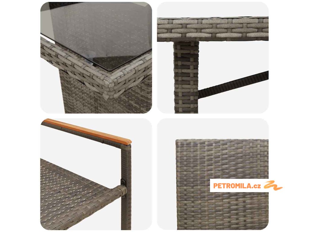 - Skleněná Povrchová Úprava Tvrzené sklo nahoře dává noblesní dotek a je praktické. Snadno se čistí a dlouho si uchovává jasnost. Tenhle odolný materiál odolává škrábancům a snese teplo, takže je perfektní na všechna venkovní jídla.