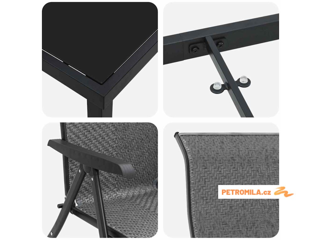 - Součásti: Set zahrnuje poly ratanová sedadla s oporou zad a pohodlnými loketními opěrkami. Stůl s temperovaným sklem poskytuje hladký a stabilní povrch, ideální pro stolování nebo jiné aktivity. Všechny části, od práškově lakovaných ocelových nohou po tkané poly ratanové opěrky, spolu dokonale spolupracují, aby zajistily pohodlí a stabilitu.