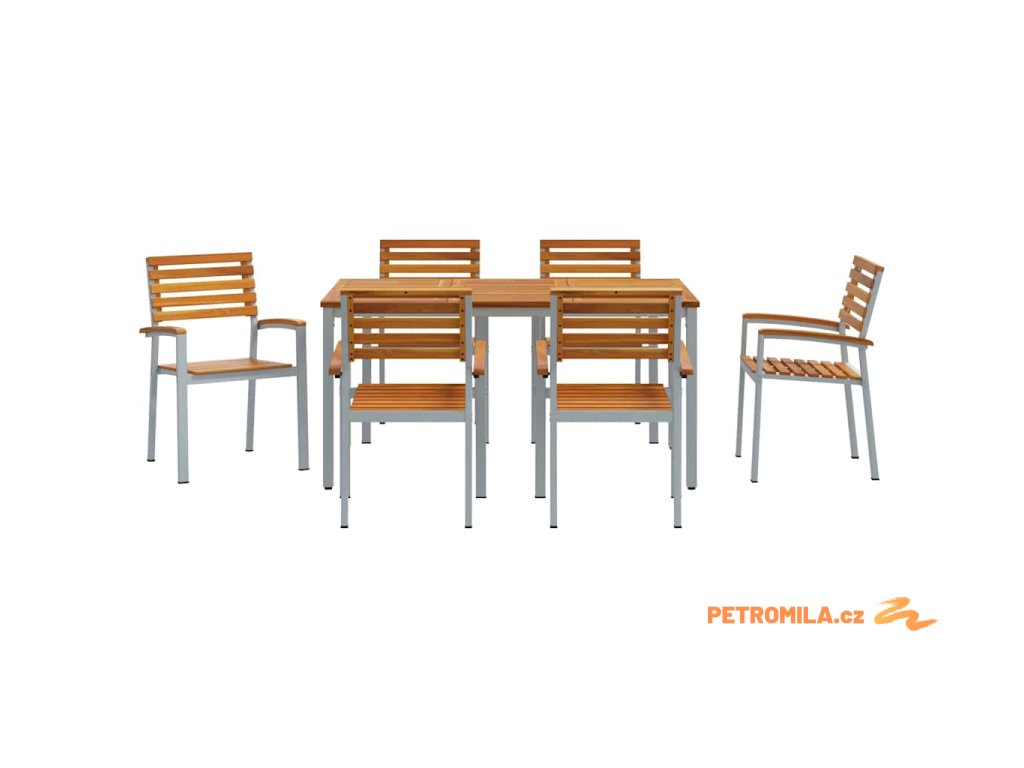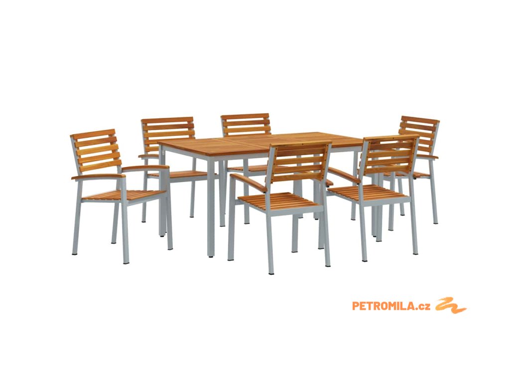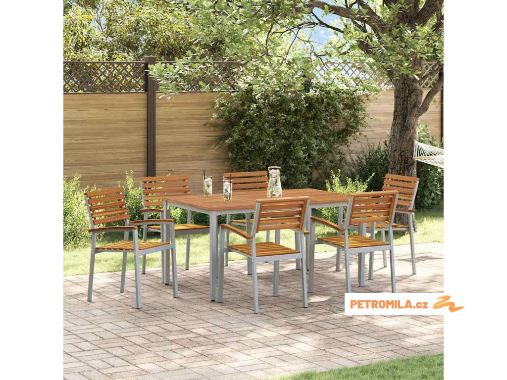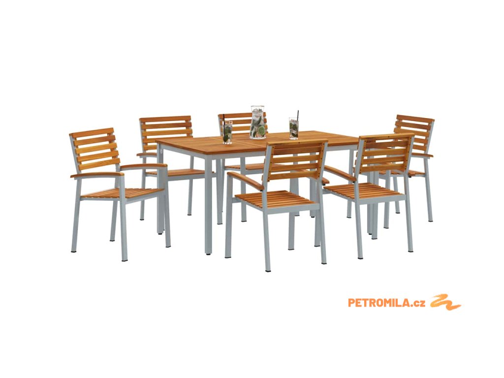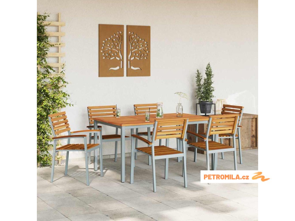 - Součásti setu: Set obsahuje prostorný stůl a dostatek pohodlných židlí, všechny vyrobené z akátového dřeva. Ocelové nohy dodávají stabilitu, takže je ideální na různé povrchy zahrady nebo terasy.