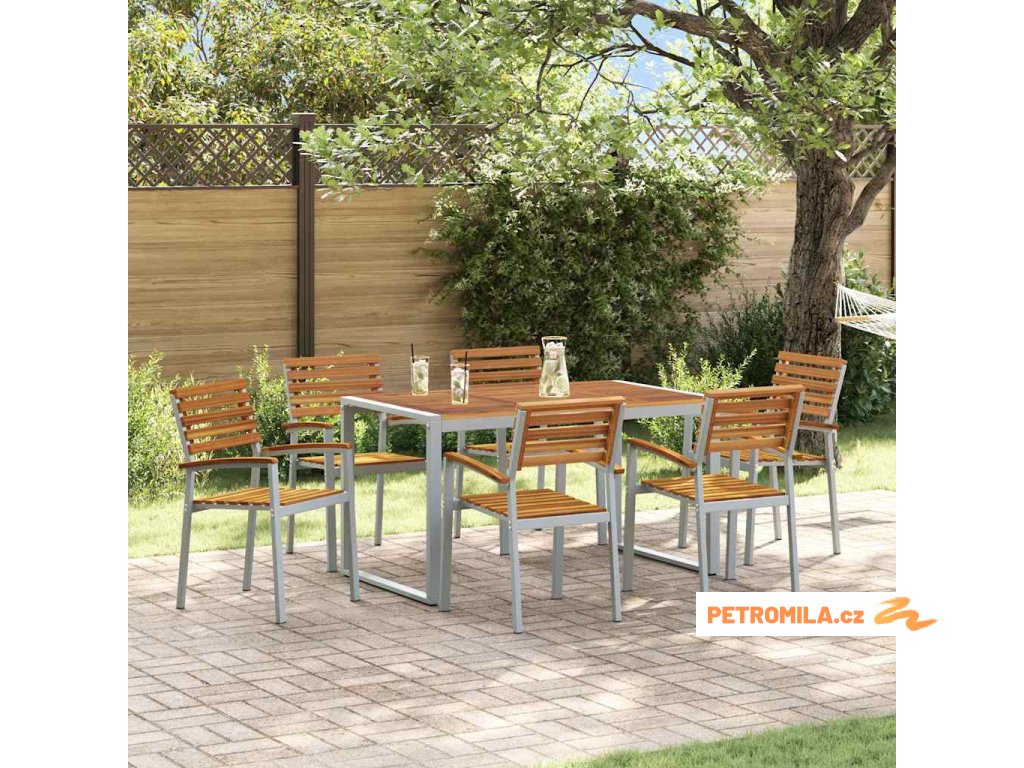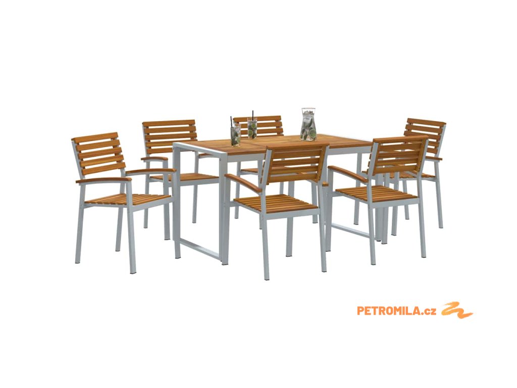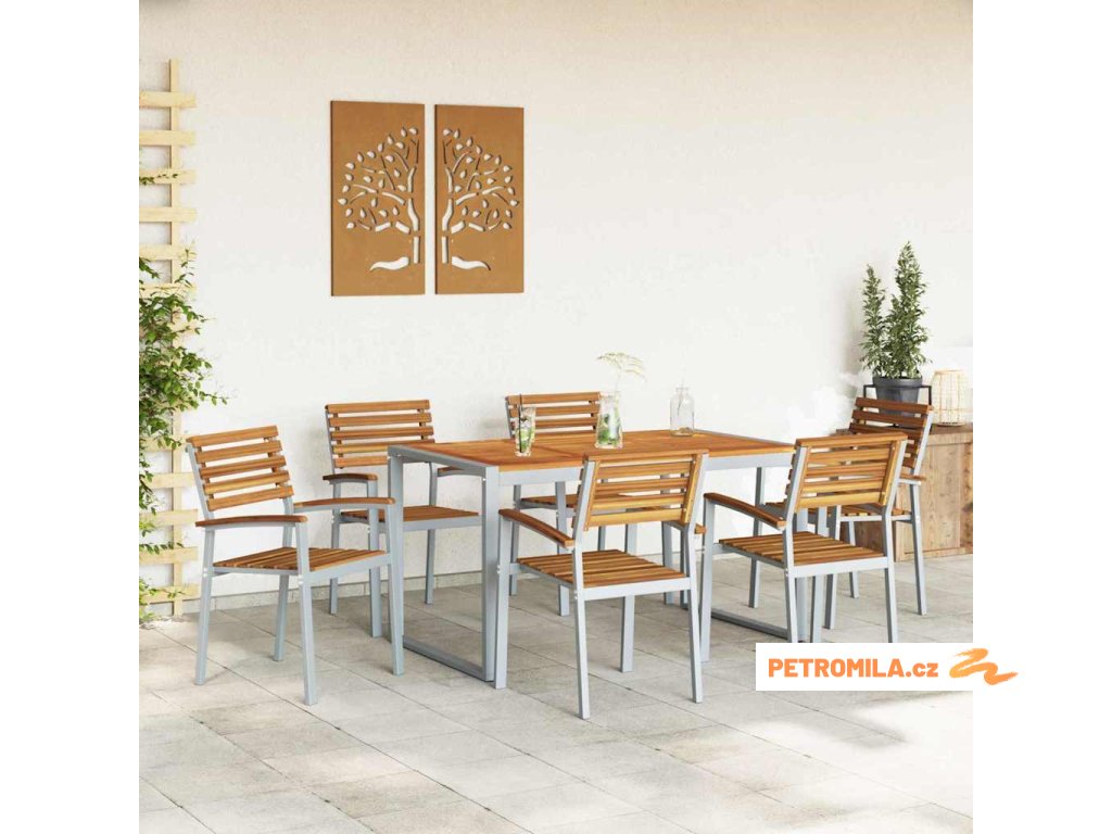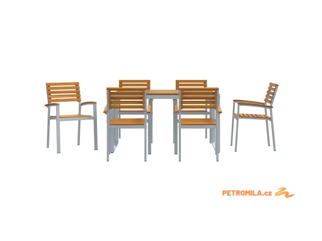 - Funkční komponenty Set obsahuje obdélníkový stůl a další židle s akáciovými deskami. Pevné ocelové nohy mu dodávají dlouhou životnost a pohodlné opěrky a sedadla jsou ideální na dlouhá jídla, protože vytváří příjemnou atmosféru.